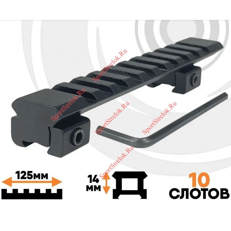 Длина планки 125 мм, высота подъема 14 мм. Планка выполнена из алюминиевого сплава, винты из стали. Винты фиксируются шестигранником (в комплекте).