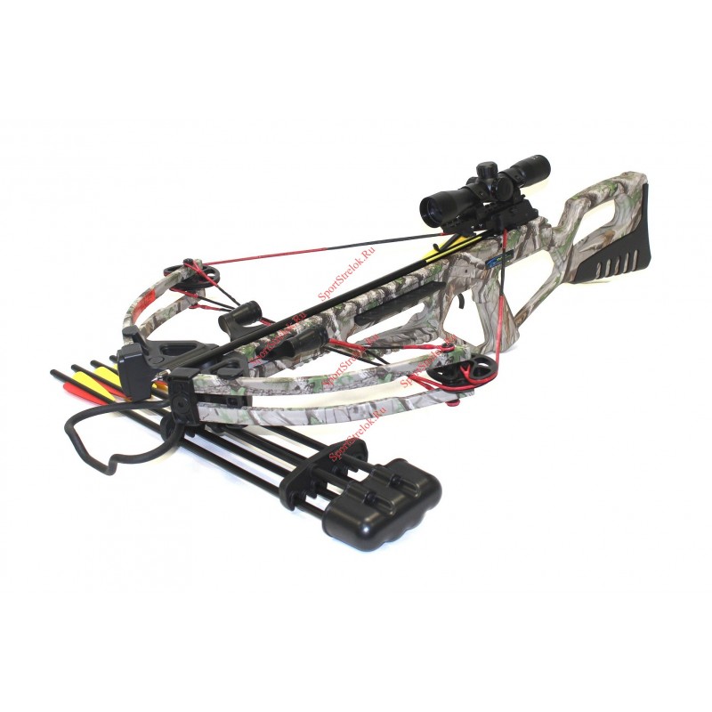 В комплекте 2: прицел оптический 4 х 32 , 4 арбалетные стрелы алюминиевые ,родной натяжитель ман кунг, ремень для переноски за плечом , подствольный кивер для стрел , тюбик воска для тетивы, ключи дюймовые для сборки.