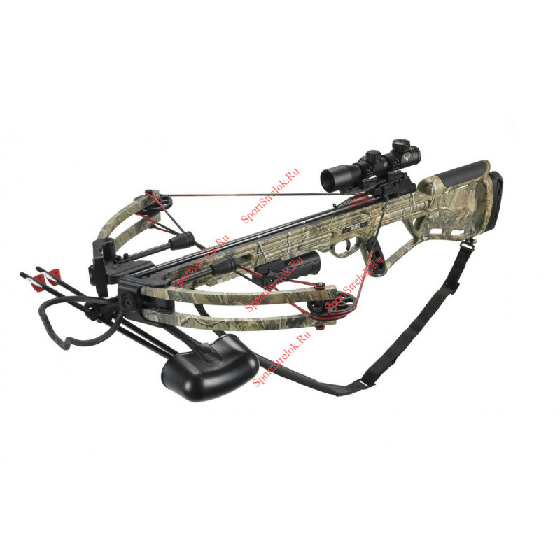 В комплекте: оптический прицел 4х32 с подсветкой, 4 алюминевые стрелы, подствольный колчан на пять стрел, плечевой ремень, воск для смазывания тетивы, натяжитель тетивы.