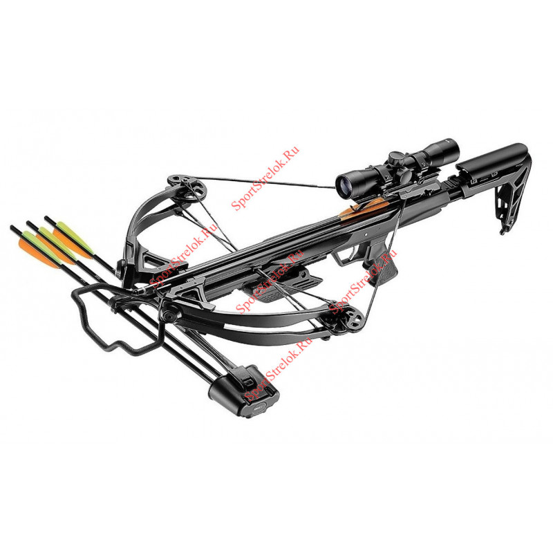 В комплекте: Оптический прицел, кивер для стрел, взводящая верёвка, 3 карбон стрелы, воск, набор ключей, ремень для переноски.