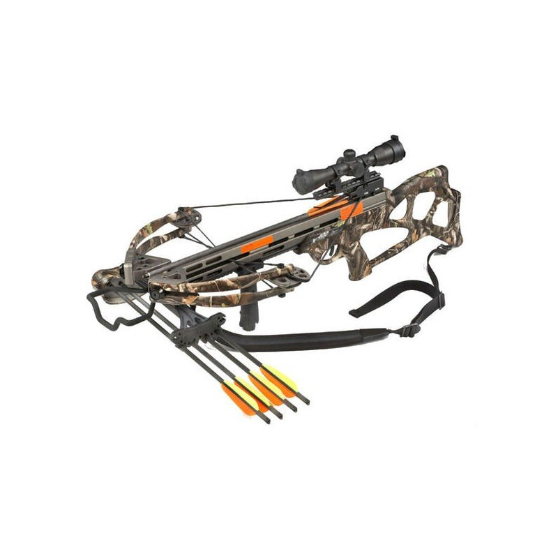 В комплекте: подствольный кивер, 4 карбоновые стрелы, 4х32 оптический прицел, натяжитель тетивы, воск для тетивы, ремень, набор ключей.
