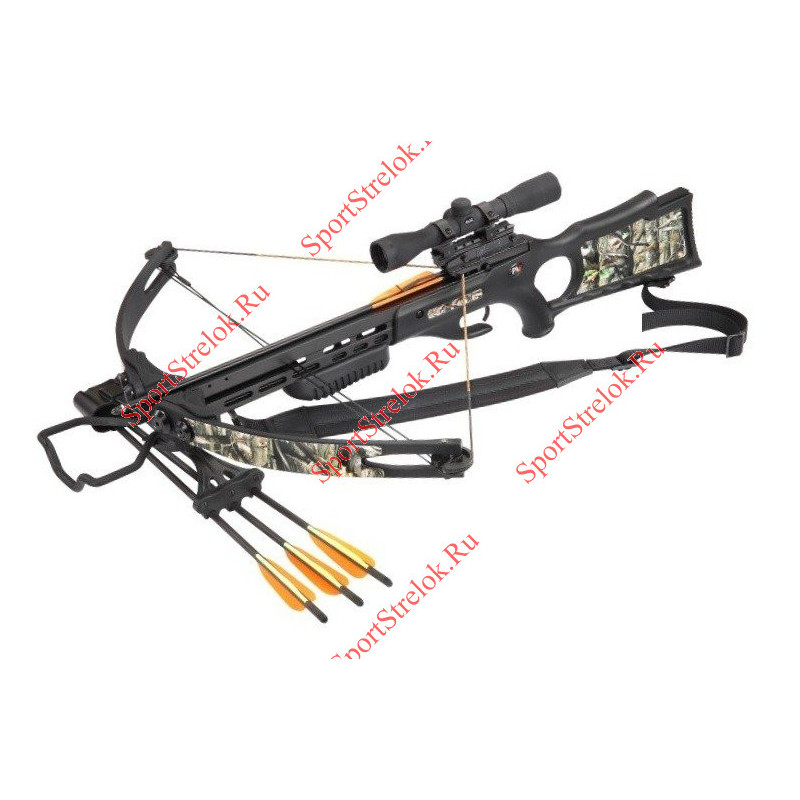 В комплекте: Оптический прицел 4*32, кивер подствольный, ремень для арбалета, четыре алюминиевые стрелы, ремень для переноски, воск.