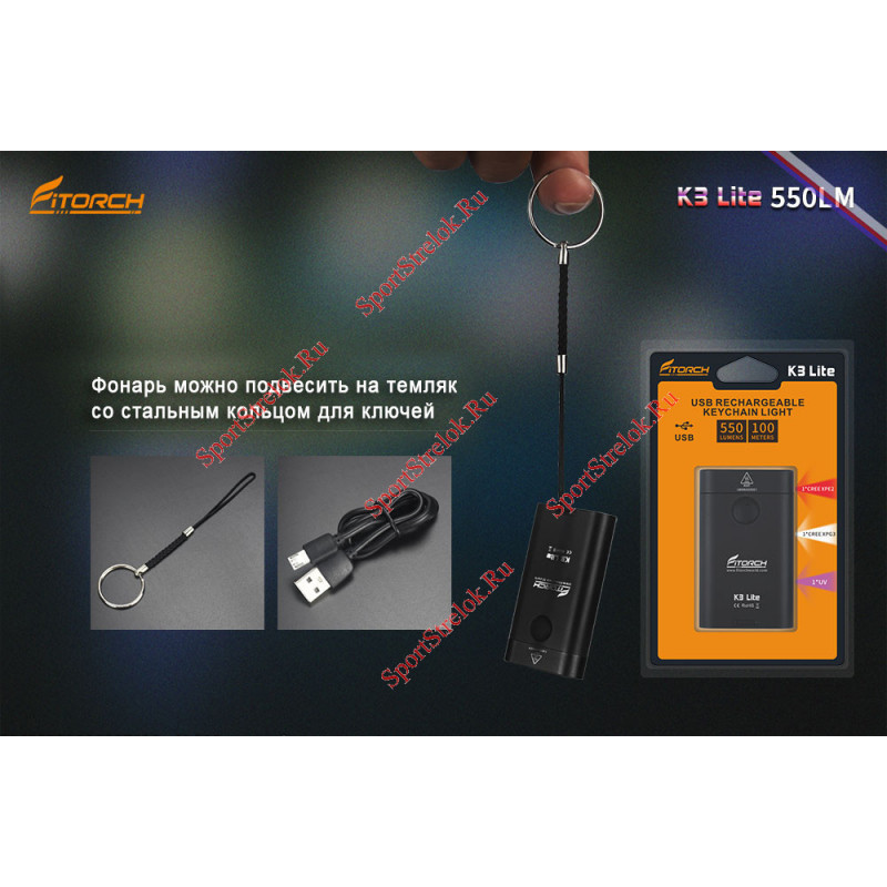 FitorchK3 Lite – миниатюрный фонарь-брелок с обычным белым, красным и ультрафиолетовым светом. Яркий свет с потоком до 550 лм позволяет осветить дистанцию до 100 м, а миниатюрные размеры и встроенное USB зарядное устройство делают такой фонарь идеальным для ежедневного применения.