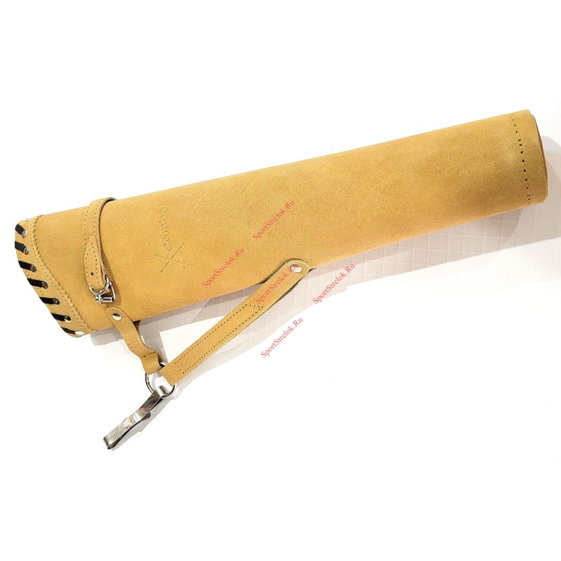 Колчан для стрел сделан из натуральной замши. Колчан имеет возможность крепления к поясу специальным зажимом. Благодаря этому зажиму колчан может быть, как быстро повешен на пояс, так и быстро с него снят. В верхней части колчан имеет оплетку из полоски натуральной кожи. Также на колчане имеется ремешок, с помощью, которого можно затянуть колчан, чтобы стрелы находились в колчане более плотно.