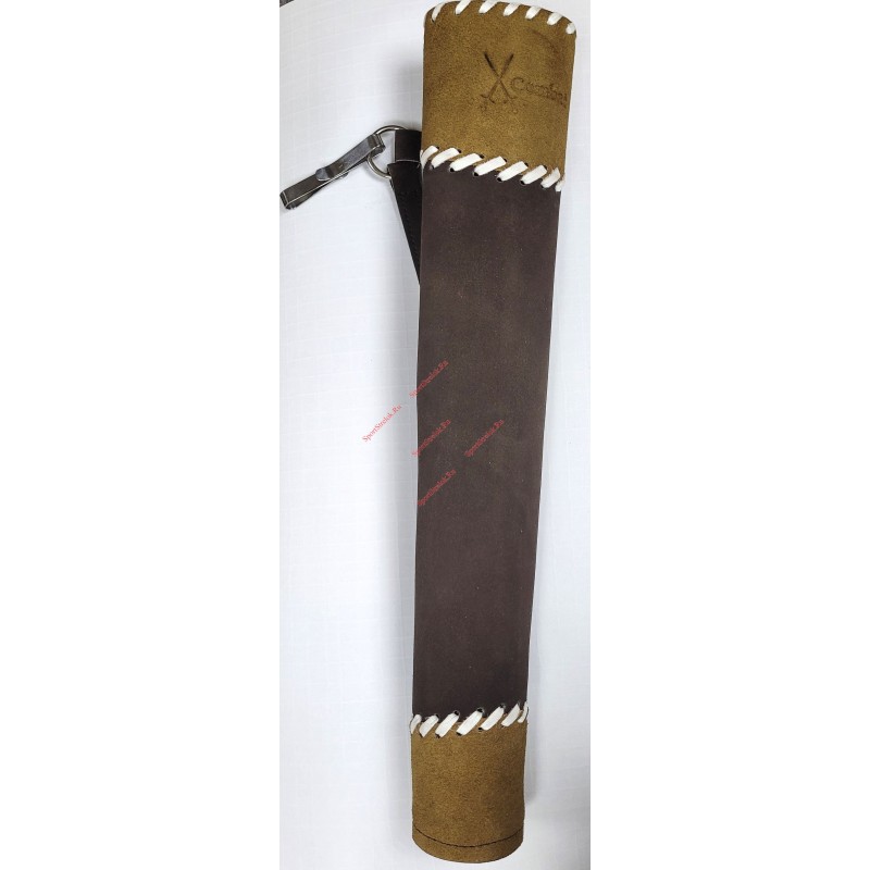Колчан для стрел сделан из натуральной замши. Колчан имеет возможность крепления к поясу специальным зажимом. Благодаря этому зажиму колчан может быть, как быстро повешен на пояс, так и быстро с него снят. В верхней и в нижней части колчан имеет вставки из замши темного цвета. Также колчан украшен вставками из белых широких полосок натуральной кожи.