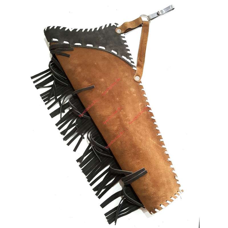 Колчан для стрел сделан из натуральной замши. Колчан имеет возможность крепления к поясу специальным зажимом. Благодаря этому зажиму колчан может быть, как быстро повешен на пояс, так и быстро с него снят. В верхней части колчан имеет вставки из замши темного цвета. Также колчан украшен вставками из белых широких полосок натуральной кожи. Бахрома сделана из натуральной замши.