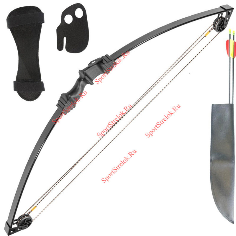 В комплекте: пластиковая полочка, прицельная планка с одной мушкой, две текстолитовые стрелы 27", колчан, крага, напальчник.