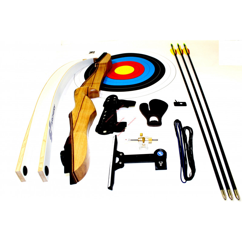 В Комплекте Лук , прицел , полочка , тетива , крага ,напалечник , 3 стрелы , мишень Fita