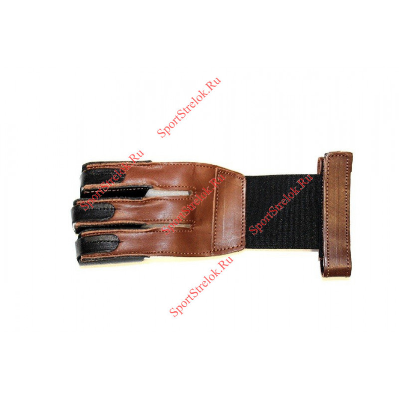 Перчатка для лука сделан из натуральной кожи. Напальчник одевается на три пальца и крепится к запястью при помощи липучки. Крепление соединяется с основной частью при помощи резинки, благодаря которой напальчник удобно сидит на руке. Внутренняя часть напальчника открытая.