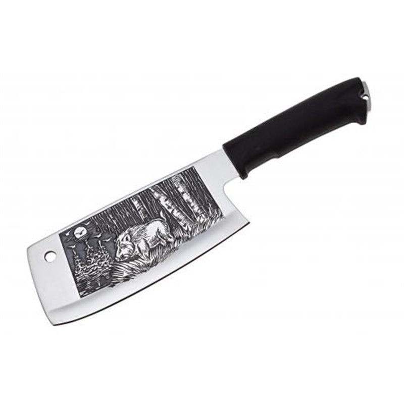 Полная длина «Вепря» составляет 310 мм, вес без ножен – 457..464 г. Нож достаточно массивный, со смещенным к острию центром тяжести, что позволяет легко перерубать куриные кости, суставы и рубить замороженное мясо. Также нож можно использовать в качестве лопатки для загрузки готовой нарезки на сковороду.