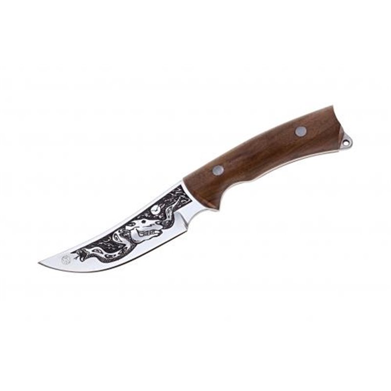 Гюрза-2 - один из первых ножей нашего производства. Нож не потерял за многие годы свою популярность благодаря своему уникальному внешнему виду и функциональным свойствам. Изогнутый клинок с подпальцевой выемкой на пяте. Рукоять из кавказского ореха. Поясные ножны из натуральной кожи. Плашки приклепаны к хвостовику.