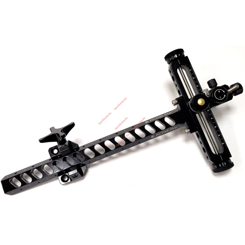 Профессиональный прицел для олимпийского и блочного лука Active PRO отличное решение для продвинутых и опытных пользователей. Высокотехнологичная конструкция перемещения каретки по двум направляющим рельсам ,надёжно фиксирует точку прицела ,не нарушая настройку при длительном использовании. Микрорегулировка по вертикали и горизонтали позволяет перемещать пин с точностью доли миллиметра. Длина штанги 9 дюймов что в свою очередь позволяет настроить прицел на любую дистанцию. Цельноалюминиевая конструкция технологии CNC весом всего 280 грамм обеспечивает прочность и надёжность прицела. Прочный металлический пин 8/32 в комплекте. Двухточечное крепление штанги сверху и снизу исключает разбалтывание быстросъёма при вибрациях лука. Анодированное покрытие всех деталей прицела сохраняет конструкцию от внешних воздействий .