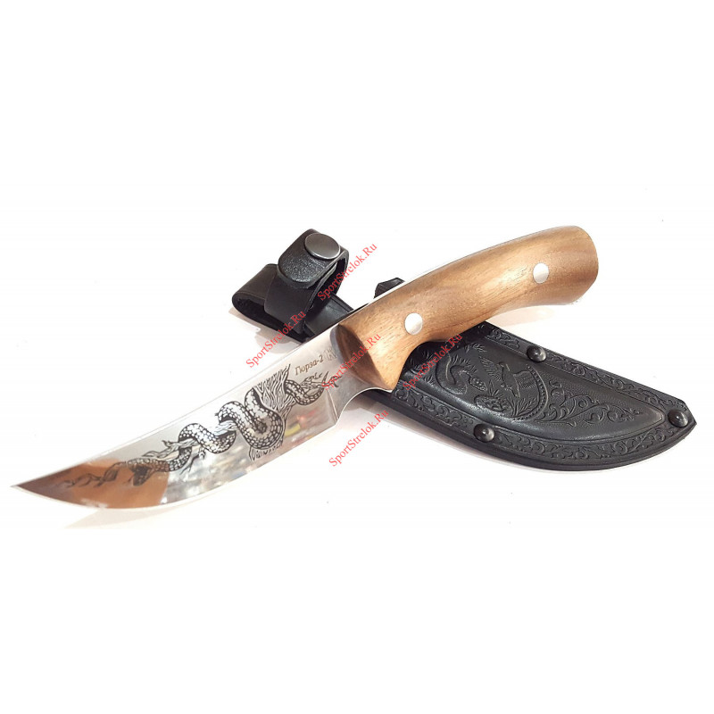 Гюрза-2 - один из первых ножей нашего производства. Нож не потерял за многие годы свою популярность благодаря своему уникальному внешнему виду и функциональным свойствам. Изогнутый клинок с подпальцевой выемкой на пяте. Рукоять из кавказского ореха. Поясные ножны из натуральной кожи. Плашки приклепаны к хвостовику.