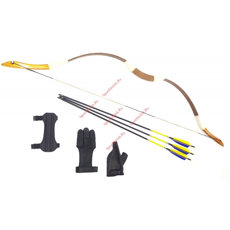 в комплекте: 3 стрелы с натур.оперением, крага кожаная, перчатка упор для укладки стрел из кожи, перчатка для натягивания тетивы из кожи.