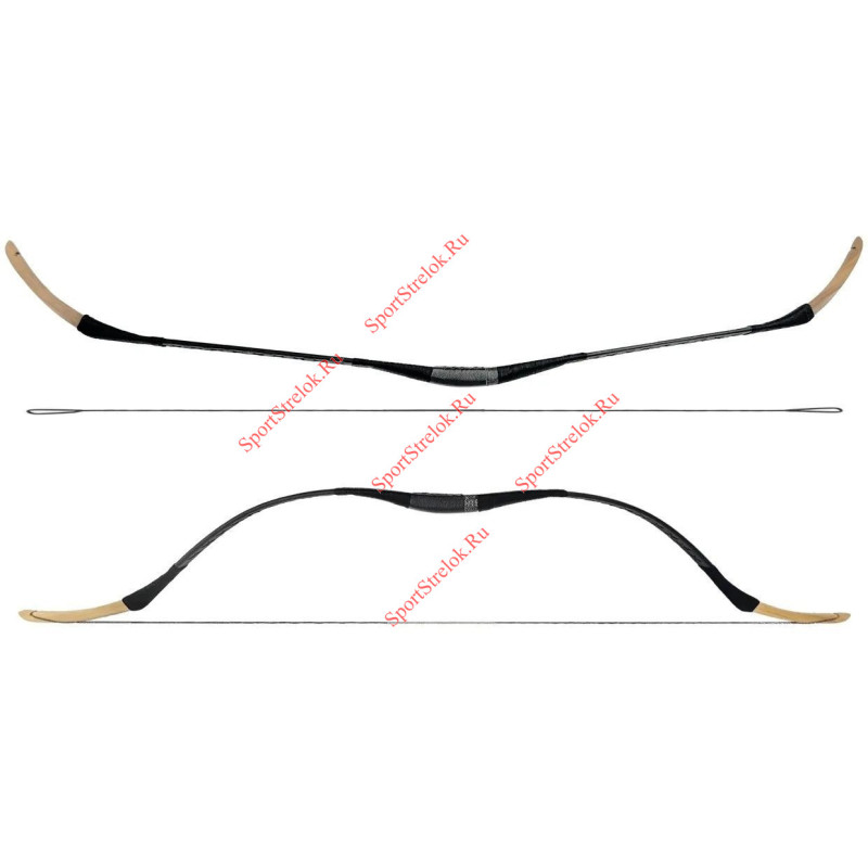 Рукоятка и рога лука выполнены из дерева, плечи - фиберглассовая ламель. Корпус оплетен экокожей и зафиксирован веревочной обмоткой. На луке отсутствует полочка. Рекомендуется использовать стрелы с натуральным оперением, а также специальную перчатку.